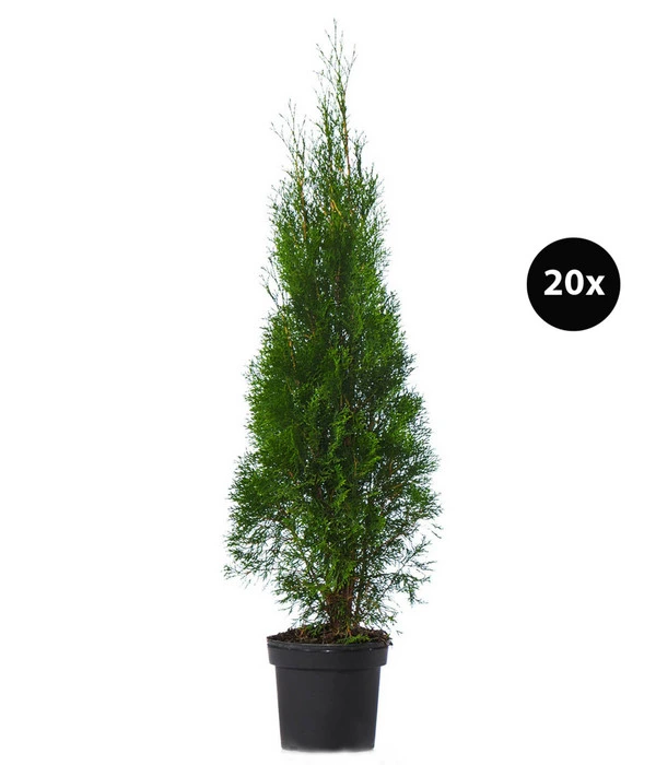Thuja-Pflanzen gehören zu den beliebtesten Gartenpflanzen und das ist kein Wunder. Denn erstens tragen sie ganzjĂ€hrig ihr frischgrĂŒnes Nadelkleid und zweitens gehören sie zu den pflegeleichtesten Heckenpflanzen, fĂŒr die Sie sich entscheiden können. Aber noch ein weiteres Merkmal trĂ€gt zu ihrer groĂen Beliebtheit bei: Die grĂŒnen Nadelgehölze erinnern ein wenig an die schlanken, hohen Zypressen, wie man sie rund ums Mittelmeer in den GĂ€rten und Parks antrifft. Auch der Lebensbaum âSmaragdâ zeigt neben dem Nadelkleid einen kegelförmigen, eher schlanken Wuchs, so dass Sie mit dieser Gartenpflanze ein wenig Mittelmeer-Feeling in Ihren Garten bringen. Die 20 krĂ€ftigen Pflanzen, die wir Ihnen hier im Paket anbieten, reichen aus fĂŒr eine dichte 7 Meter lange Sichtschutzhecke. So lang muss Ihre Hecke nicht werden? Dann setzen Sie einfach einige Pflanzen Lebensbaum âSmaragdâ als immergrĂŒne Solisten und Strukturgeber in Ihre Gartenanlage!
