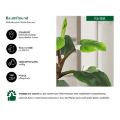 So dekorativ der Philodendron ‘White Princess‘ auch ist, er ist ebenso unkompliziert und pflegeleicht wie seine Geschwister. Er wünscht sich einen hellen, aber nie vollsonnigen Standort bei angenehmer Zimmertemperatur. Ein Wunsch, den Sie ihm sicherlich leicht erfüllen können. Gegossen werden Philodendren regelmäßig, Sie sollten aber auf jeden Fall Staunässe vermeiden. Im Winter wird natürlich weniger gegossen. Auch eine hohe Luftfeuchtigkeit wirkt sich positiv auf sein Wohlbefinden aus, weshalb Sie die Pflanze regelmäßig mit kalkarmem Wasser besprühen sollten.