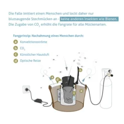 Der Mechanismus der Biogents BG-Mosquitaire CO2 Mückenfalle ist so einfach wie sicher. Dabei ahmt der beiliegende Duftbeutel mit dem BG-Sweetscent Lockstoff die Hautgerüche des menschlichen Körpers nach. Hinzu kommen gezielt eingesetzte Schwarz-Weiß-Kontraste, die für Mücken die visuellen Reize eines Menschen simulieren. Zu guter Letzt wirkt das CO2 als Bestandteil des menschlichen Atems zusätzlich unwiderstehlich anziehend. Das Gerät besitzt ein CO2-Set, Sie müssen nur noch die passende CO2-Flasche besorgen und anschließen.