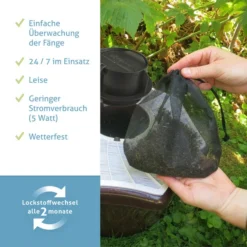 Die Verwendung der Biogents BG-Mosquitaire Mückenfalle ist denkbar einfach. Alles, was Sie dafür tun müssen, ist, sie an einem passenden Ort aufzustellen, anzuschließen, das Duftsäckchen einzulegen und in Betrieb zu nehmen. Ideale Aufstellorte finden sich neben einem Busch, wo Stechmücken typischerweise rasten oder an einer Stelle mit hoher Luftfeuchtigkeit. Lassen Sie das Gerät nun durchgehend laufen, es ist leise, wetterfest und braucht wenig Strom. Das Beste: es deckt eine Fläche von ca. 600 m² ab!