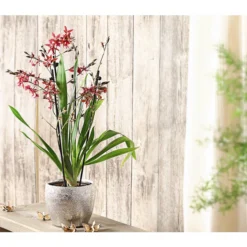Stellen Sie sich vor, Sie kommen nach Hause und werden in Ihrem Wohnraum von einem intensiven Rosenduft empfangen… dann wissen Sie: Das ist die neue Burrageara! Die Burrageara ‘Lazio‘ gehört zu den Duft-Orchideen und blickt auf eine spannende Herkunftsgeschichte zurück. Bereits 1927 wurde sie von dem Amerikaner Burrage, dem Präsidenten der Amerikanischen Orchideen-Gesellschaft, aus verschiedenen Gattungen gezüchtet. In ihrem Stammbaum gibt es so edle Namen wie Oncidium, Miltonia, Odontoglossum und Cochlioda. Und jeder dieser Vorfahren hat der Pflanze eine Facette seiner interessanten Optik vermacht. Als Orchideen-Kenner werden Sie vielleicht entdeckt haben, dass die bis zu 5 cm großen Blüten, die an Stiefmütterchen erinnern, auf die Gattung Miltonia zurückgehen, während die Cochlioda für die knallig rote Farbe verantwortlich ist. Wenn die ‘Lazio‘ gerade Ihr Gärtner-Herz erobert hat, dann geben Sie noch heute der kostbaren Regenwald-Schönheit ein Plätzchen in Ihrem Zuhause! Und freuen sich schon jetzt auf die duftenden Blüten, mit denen die Orchidee Ihr Wohnambiente mit etwas Glück sogar zweimal im Jahr verzaubern wird!