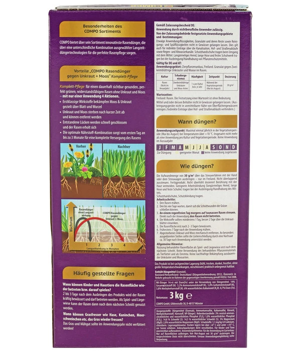 Um einen nachhaltigen Erfolg mit COMPO FLORANID® Rasendünger gegen Unkraut und Moos 4in1 zu erreichen, verfahren Sie bitte genau nach Anleitung. Bringen Sie 30g/m² aus, achten Sie darauf, COMPO FLORANID® Rasendünger gegen Unkraut und Moos 4in1 nicht überlappend zu streuen oder überhöht zu dosieren. Vor dem Ausbringen von COMPO FLORANID® Rasendünger gegen Unkraut und Moos 4in1 mähen Sie den Rasen und lassen die Schnittwunden 2-3 Tage verheilen. Haben Sie COMPO FLORANID® Rasendünger gegen Unkraut und Moos 4in1 dann an einem regenfreien Tag ausgebracht, wässern Sie erst nach 2-3 Tagen und mähen nicht vor dem Ablauf von 7 Tagen.