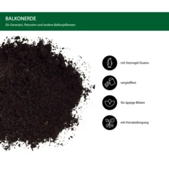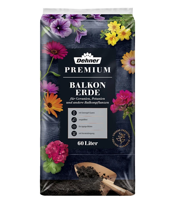 Jeder, der schon einmal blühende Balkonpflanzen in Töpfen und Kästen hatte, weiß, dass diese einen großen Bedarf an hochwertigen Nährstoffen haben, um uns den ganzen Sommer mit immer neuen Blüten zu beschenken. Deshalb verfügt die Dehner Premium Balkonerde über einen Startdünger, der Ihre Blühpflanzen die ersten 6 Wochen mit allen wichtigen Nährstoffen versorgt. Außerdem wurde die Spezialerde mit echtem Guano aufgedüngt. Das sind die Hinterlassenschaften der Seevögel an der Küste Perus, die seit langem als wertvoller, natürlicher Dünger bekannt sind. Besonders der hohe Anteil an den essentiellen Pflanzennährstoffen Phosphor und Stickstoff macht Guano so wertvoll. Sie werden es Ihren Pflanzen ansehen, wie wohl sie sich in der Dehner Premium Balkonerde fühlen.