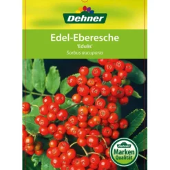 Früher gehörten Ebereschen zur Grundausstattung eines jeden Gartens, mit dem Trend zu immer kleineren Grundstücken verschwanden diese attraktiven, bis zu 20 m hohen Bäume aber aus den Wohngebieten. Mit der Eberesche ‚Edulis‘ können wir Ihnen jetzt eine Sorte vorstellen, die deutlich niedriger bleibt und deshalb auch für kleine Gärten perfekt geeignet ist. Denn es wäre wirklich schade, auf einen so wunderbaren Baum verzichten zu müssen! Die Eberesche ‚Edulis‘, die auch Vogelbeere, Drosselbeere und Krametsbeere genannt wird, ist ein prächtig anzuschauender Baum mit einer lichten Krone, der Ihren Garten mit Blüten, Beeren und schönem Laub schmückt. Die großen, weißen, zart duftenden Blütendolden erscheinen zwischen Mai und Juni und im Laufe des Sommers entwickeln sich daraus üppige Beerendolden, die sich ab August in leuchtendem Orange von den grünen Blättern abheben. Und dann heißt es, sich zu beeilen. Denn die Beeren sind nicht nur essbar, sondern sogar sehr süß, aromatisch und reich an Vitamin C. Sie können roh verzehrt oder zu Marmeladen, Gelees, Kompott und Likör verarbeitet werden. Aber wie gesagt: Schnelligkeit ist angesagt, denn die Beeren der Eberesche ‚Edulis‘ sind auch bei Vögeln sehr beliebt.