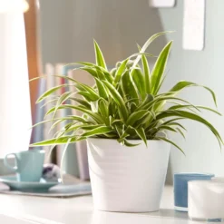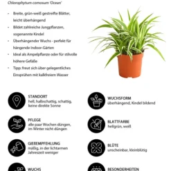 Fühlt sich die Grünlilie bei Ihnen wohl, wird sie im Laufe der Zeit unscheinbare, weiße Blüten an den langen, gelben Blütenschäften entwickeln. Nach der Blüte entwickeln sich dort neue kleine Pflänzchen, diese Ableger nennt man Kindel. Diese Jungpflänzchen hängen zahlreich an der Pflanze herunter, deshalb eignet sich die Grünlilie ideal als Ampelpflanze oder für höhere Gefäße, wo ihre ‚Brautschleppe‘ optimal zur Geltung kommt.