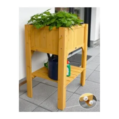 Das Hochbeet Kompakt mit Ablage ist für Freunde von wohnlichen, bepflanzten Gärten genau das richtige Möbelstück für den Außenbereich. Es eignet sich darüber hinaus sehr gut für den Balkon, denn es sorgt für eine natürliche, lebhafte und freundliche Atmosphäre, was vor allem bei kalt wirkenden Balkonen aus Stein für eine farbenfrohe Aufwertung sorgt. Dieses Hochbeet ist mit perforierter Folie ausgekleidet – so wird das Holz vor Feuchtigkeit geschützt und es rieselt keine Erde heraus. Unterhalb befindet sich eine praktische Ablage. Hobbygärtner nutzen das Hochbeet Kompakt mit Ablage und pflanzen Gemüse, Kräuter oder Blumen an, um die Keimlinge danach perfekt in der Sonne oder im Schatten platzieren zu können, je nachdem, was die Samen benötigen.