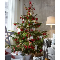 Allein durch ihren schönen Wuchs und das dichte Nadelkleid ist eine Nordmann-Tanne immer ein Hingucker im weihnachtlich geschmückten Zuhause. Mit einer ausgewählten Deko können Sie Ihrem Weihnachtsbaum aber eine ganz persönliche Note geben. Ganz gleich, ob Sie Kugeln, Schleifen, Sterne oder andere Deko-Elemente bevorzugen, beschränken Sie sich dabei nur auf eine oder zwei Farben. Die stilvolle Ausstrahlung Ihres Weihnachtsbaums wird von jedem bewundert werden.
