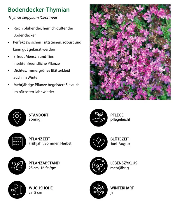 Das Staudenset Duftender Thymian hat eigentlich nur zwei Wünsche an Sie: einen sonnigen bis halbschattigen Standort in einem durchlässigen und gerne trockenen Boden. Erfüllen Sie den Pflanzen diese Wünsche, werden sie fast von allein viele Jahren Ihren Garten schmücken. Sie brauchen kein Wasser und keine Düngegaben und auch keinen Rückschnitt im Herbst. Und natürlich ist der pflegeleichte Bodendecker auch winterhart.