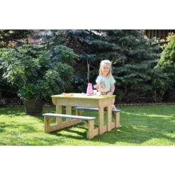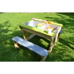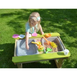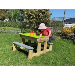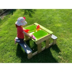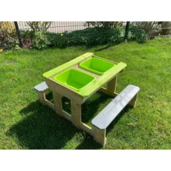 Sie wollen Ihren Kindern einen ganz besonderen Spielbereich zukommen lassen? Dann wird Sie der Sand- und Wassertisch von Wendi Toys überzeugen! Er eignet sich sehr gut, um das gemeinsame Frühstück oder ein Picknick mit Kindern ab drei Jahren in den Garten zu verlegen, aber es warten noch weitere Vorzüge auf Sie. Unter der Tischplatte befinden sich zwei Behälter, die Sie nach Belieben mit Sand oder Wasser füllen können. Ihre Kinder oder Enkelkinder werden viele spaßige Stunden mit Sandburgenbauen oder Wasserschöpfen beschäftigt sein und haben dafür immer einen festen Platz in Ihrem Außenbereich. Sollte die Spielzeit einmal zu Ende sein und Sie den Sand vor Nässe schützen wollen, dann platzieren Sie den abnehmbaren Deckel einfach wieder auf dem Tisch.