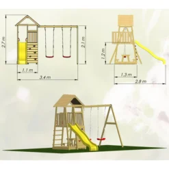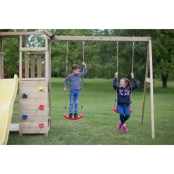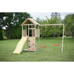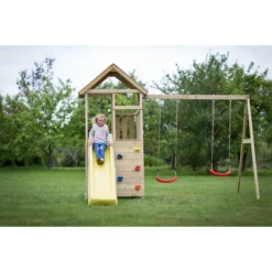 Sie wollen für Ihre Kinder im Garten ein eigenes Spielparadies errichten? Dann ist der Spielturm Giraffe von Wendi Toys genau das Richtige für Sie! Der Turm eignet sich für Kinder ab vier Jahren und bietet viele spannende Möglichkeiten, um richtig schön herumzutoben. Die Rutsche sowie die Kletterwand sorgen für ordentlich Spaß und Abwechslung. Auf der kleinen Veranda mit zwei Sitzbänken und Tisch können sich die Kleinen zurückziehen und eine Pause vom Spielen einlegen, um danach Ihre Zeit auf den zwei Schaukeln zu genießen. Damit es für Ihre Lieben rundum sicher ist, wurde das Spielgerät mit abgerundeten Ecken und Kanten ausgestattet. So können Sie Ihre Kinder sorgenfrei nach draußen zum Spielen schicken und Ihnen viel Kletter- und Rutschspaß gönnen.